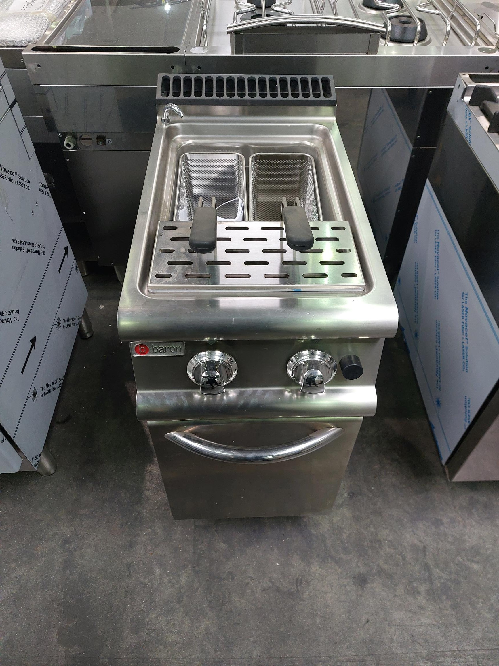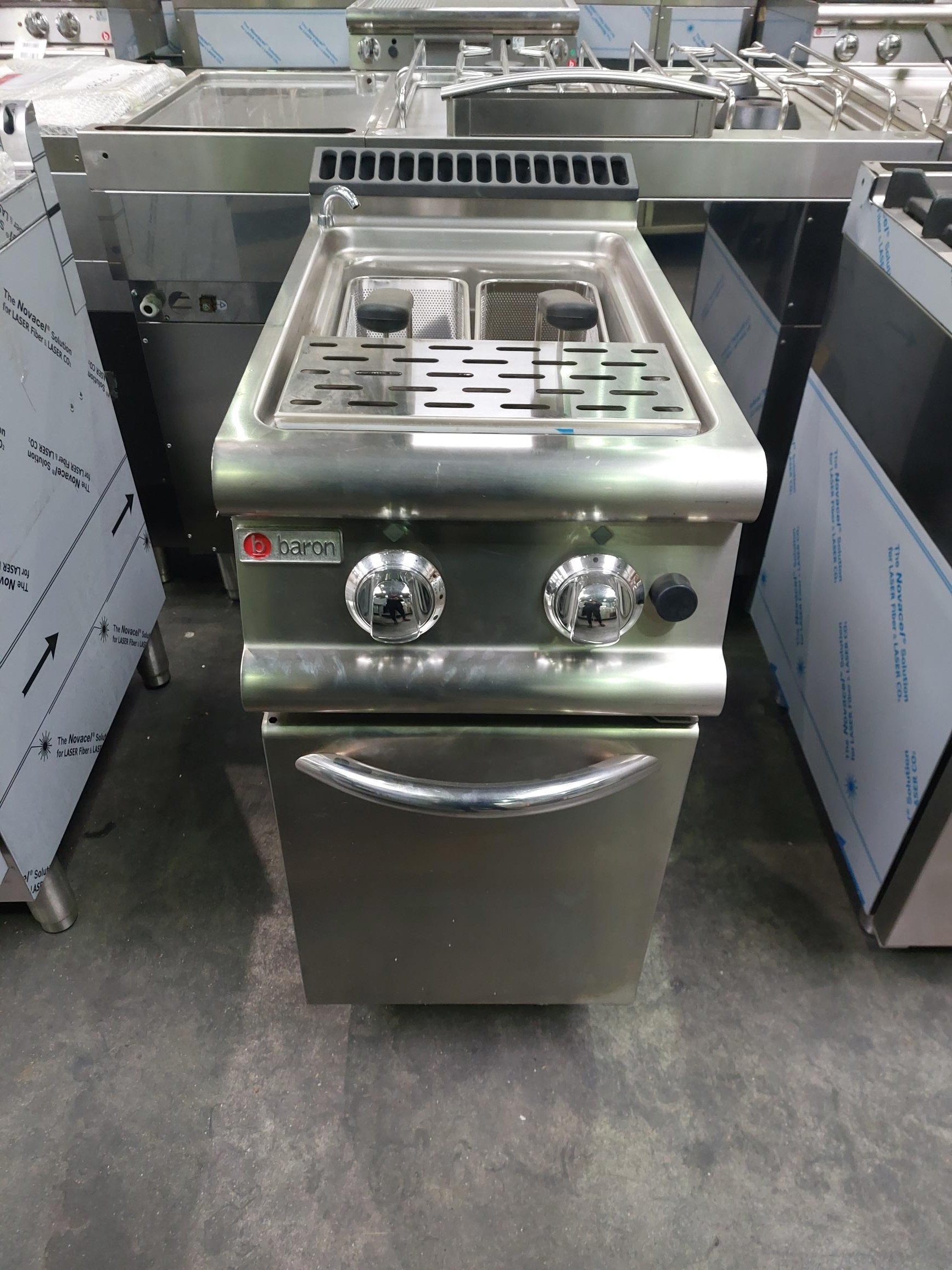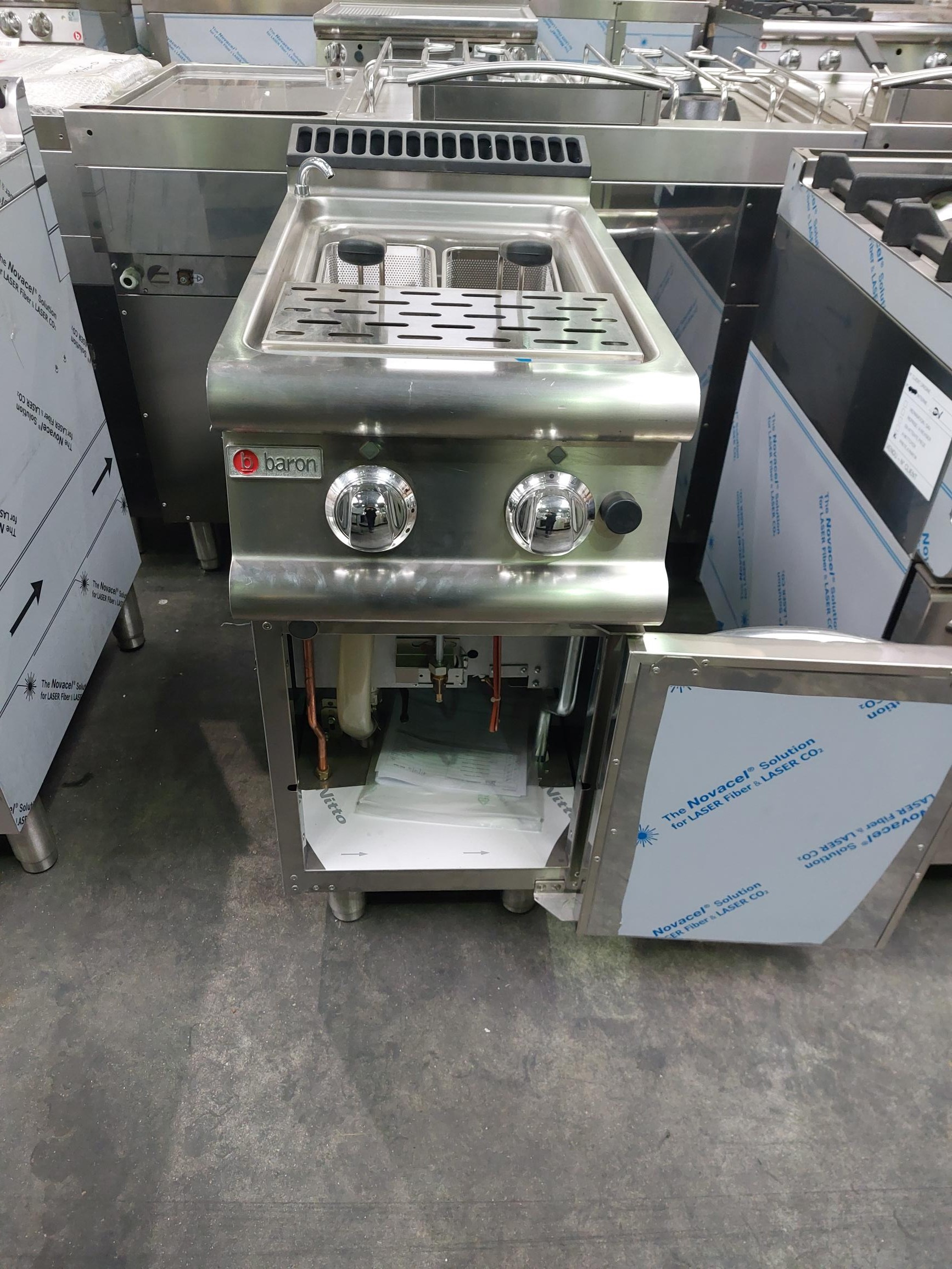 Tous les cuiseurs à pâtes gaz de BARON et appartenant à la Gamme 700 sont réalisées en acier inox AISI 316, finies de façon raffinée avec un satinage Scotch Brite et ont comme particularités d'avoir des angles arrondis et des récipients d'une grande capacité. D'une profondeur de toujours 700 mm et d'une largeur modulaire, la gamme 700 de BARON est complétée par des supports. Les cuiseurs à pâtes professionnels de la gamme 700 sont facilement modulables avec les autres équipements de la série, afin de permettre de constituer une unité compacte, sans espaces et donc avec la plus grande hygiène possible.