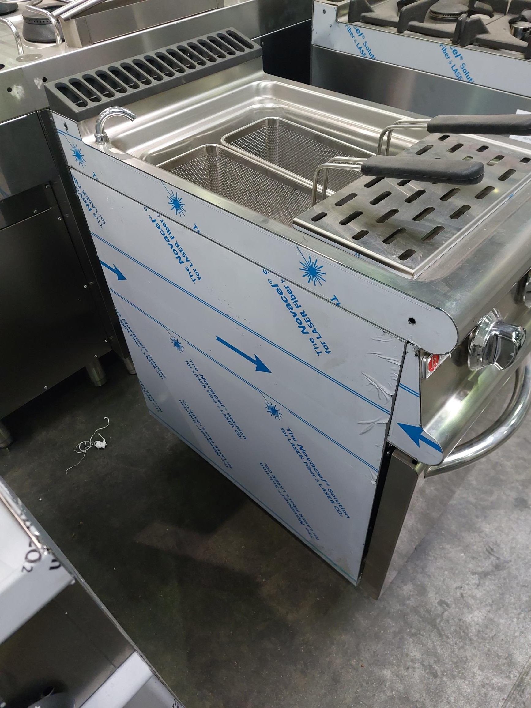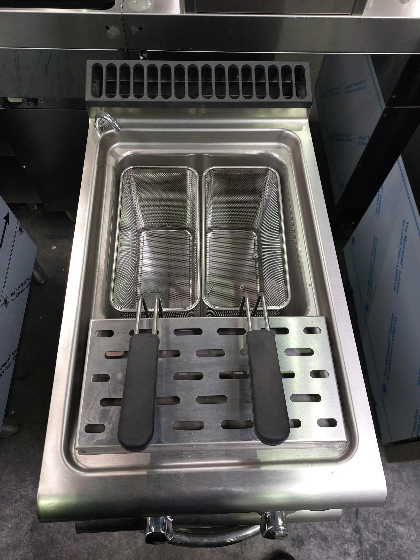 Il est livré avec 1 grille de fond de cuve et de 2 paniers inox GN 1/3 de dimension 145 x 590 x 215 mm par cuve.