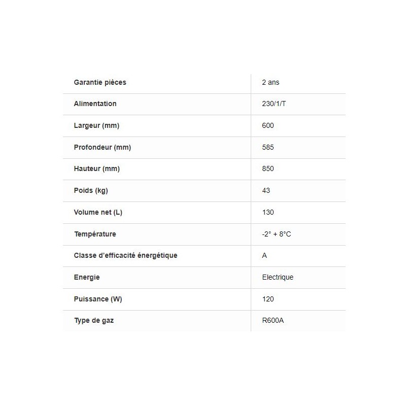 Puissance : 120 W Niveaux : 5 niveaux - pas de 70 mm Dotation : 2 grilles 502 x 415 mm + 1 grille 502 x 211 mm Poids maxi /grille : 15 kg Classe énergétique : A Volume net : 130 L Dimensions (L x P x H) : 600 x 585 x 850 mm Poids : 43 kg