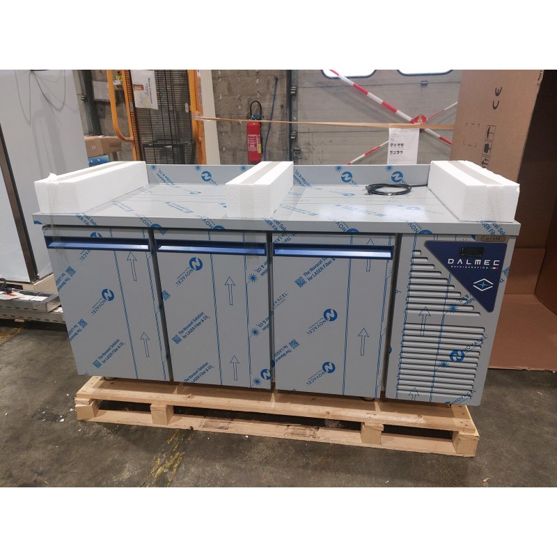 Description de la table réfrigérée avec dosseret, positive 0/+10°C, avec groupe logé froid - 460 L - 3 portes - Dalmec