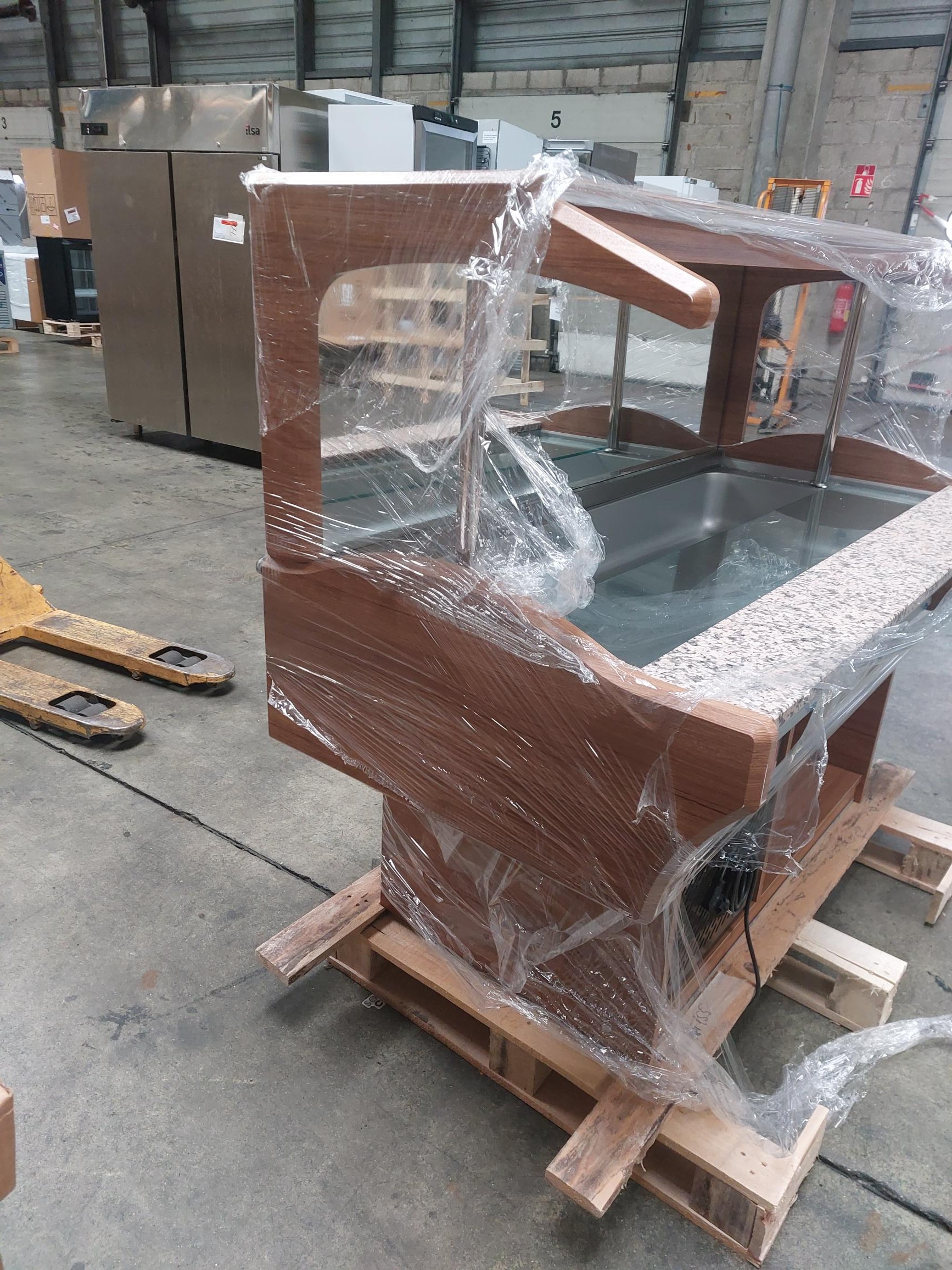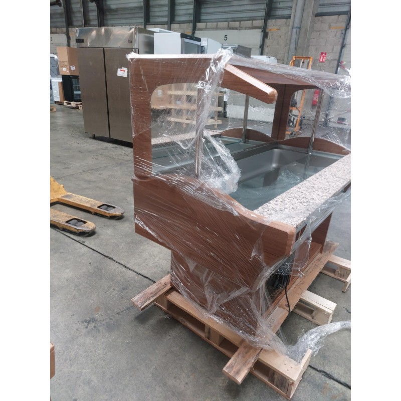 Température 0°C +10°C Coloris noyer Réfrigération statique Tablette en granit coloris Rosa Porino Thermostat électronique Cuve inox AISI 304 Gaz réfrigérant : R134a Capacité 4 bacs GN1/1 profondeur 150 mm (bacs non fournis)