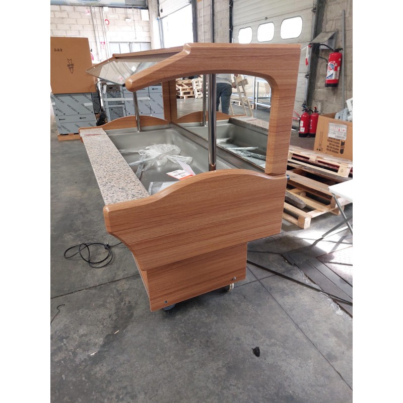Température 0°C +10°C Coloris noyer Réfrigération statique Tablette en granit coloris Rosa Porino Thermostat électronique Cuve inox AISI 304 Gaz réfrigérant : R134a Capacité 4 bacs GN1/1 profondeur 150 mm (bacs non fournis)